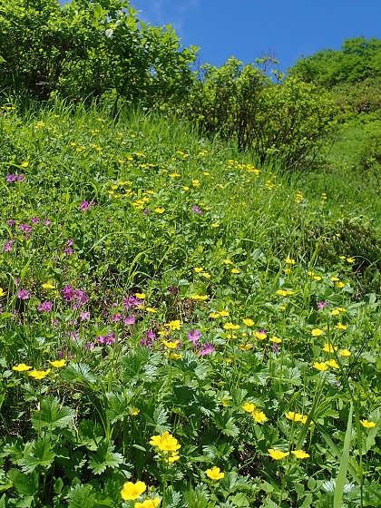 雪田脇の草原には、チシマノキンバイソウとミヤマキンポウゲの競演